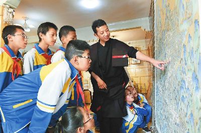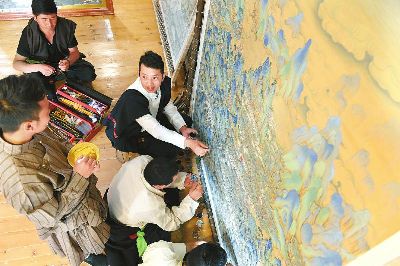 著著是當(dāng)?shù)匦∮忻麣獾漠嫀?,?4歲從臨摹、勾線定型、著色染色開始學(xué)起,3年后就出師獨立作畫。17年時間,他繪制了3000多平方米的壁畫和數(shù)百幅唐卡,光筆就畫禿了20000多支。去年,著著憑借《南絲路一帶緣藏漢人一家親》成為當(dāng)年文藝界最高獎山花獎的獲得者。今年,他圍繞“一帶一路、藏漢和睦”為主題而創(chuàng)作的大幅唐卡畫作也即將收尾。