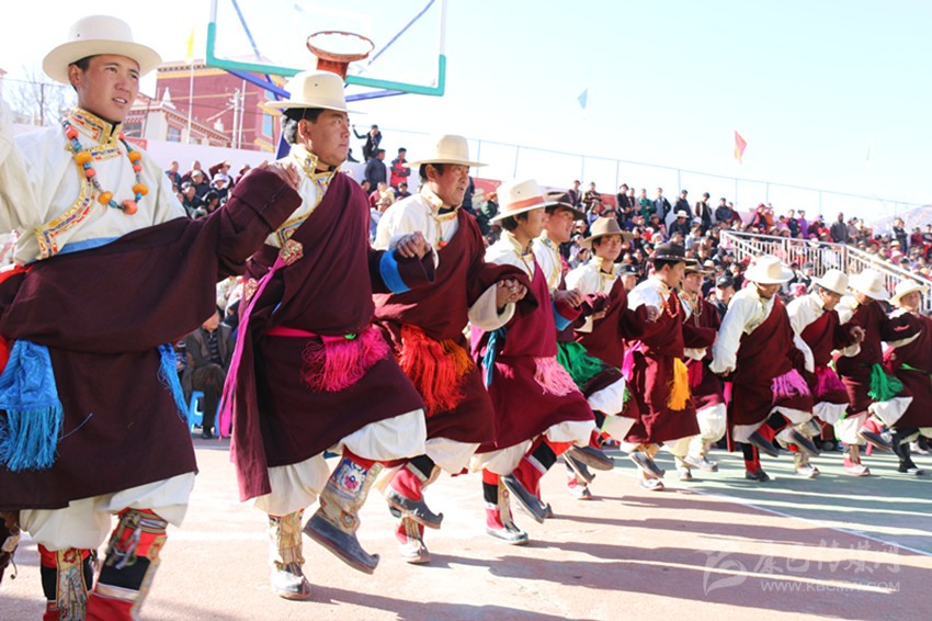 弦子比賽開始了。精神矍鑠,頭戴紅須“嗦啊”的扎西第一個出場。白色“仙子”(藏式襯衫)的長袖一層層疊到手腕,藍緞子藏式背心在陽光的映襯下,顯得格外光亮耀眼。一把彩色弦胡抵在左腰,左手幾個指姆在馬尾琴弦上靈動地起落按擦,右手輕松自如地拉動琴弓,琴弦伸縮間,琴筒里發(fā)出悠揚的弦子聲。他扯開嗓子起音,聲音宏亮,身后十一個胡琴手齊拉共唱,后面一百多位著盛裝的男女舞者動作整齊劃一,一個回環(huán)往復的圓圈逐漸形成,原生態(tài)歌聲化漾開去,從廣場的四面八方升騰起來,在天際飄蕩: