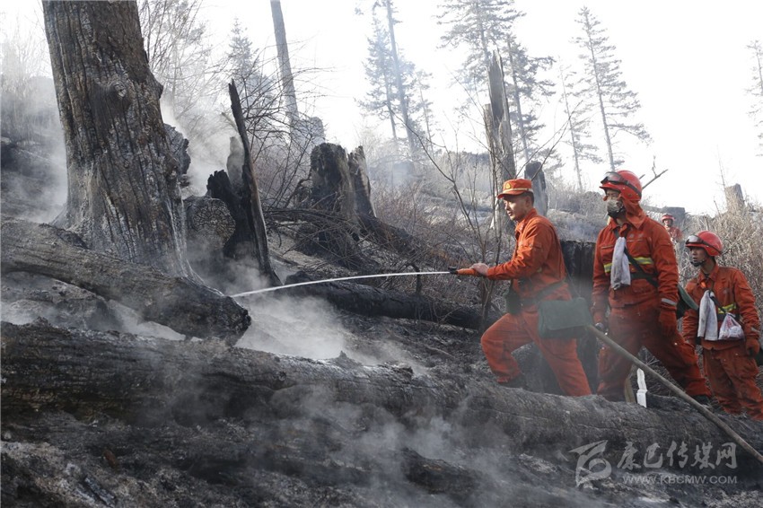 2月10日,火頭蔓延至火場東北一線,參戰(zhàn)官兵發(fā)現(xiàn)幾處被冰雪覆蓋的水源,火場前指決心改變戰(zhàn)法,采用7組水泵串聯(lián)接力向火場供水主攻明火,常規(guī)機(jī)具輔助配合消除煙點(diǎn)的方式,將部隊(duì)分為水泵和常規(guī)機(jī)具兩個(gè)梯隊(duì),在火場火勢最為猛烈的東北側(cè)展開滅火作戰(zhàn)。參戰(zhàn)官兵用自身攜帶的鍬鎬奮力破冰面抽水,在水泵的助力下,明火得到了有效壓制并逐步熄滅。隨后,部隊(duì)和地方群眾全部轉(zhuǎn)入火場清理看守階段。