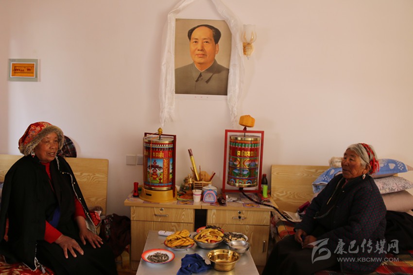 從餐廳出來(lái),記者走進(jìn)了一間15平方米左右的宿舍。兩位老人正坐在各自的木床上看電視,墻上掛著的液晶電視是連著機(jī)頂盒的。兩床之間,放著藏桌和床頭柜,藏桌上有瓜子、花生、酥油果子、牛肉等食品,亞瑪翁青老人熱情地說(shuō):“因?yàn)檎谶^(guò)藏歷新年,這些都是福利院為我們備的年貨,你也嘗嘗!”。房間里最引人注目的便是掛在床頭柜上方的系著哈達(dá)的毛主席畫像,兩位老人指著毛主席畫像動(dòng)情地說(shuō):“毛主席、共產(chǎn)黨是我們的恩人,看著他的畫像我們安心。”此外,房間里還有衣柜、配有馬桶的獨(dú)立廁所和盥洗臺(tái),毛巾、漱口盅、掃把、拖把都整齊地放在對(duì)應(yīng)位置。亞瑪翁青笑著說(shuō):“我們住的房間都趕得上縣城里的賓館了?!?/span>