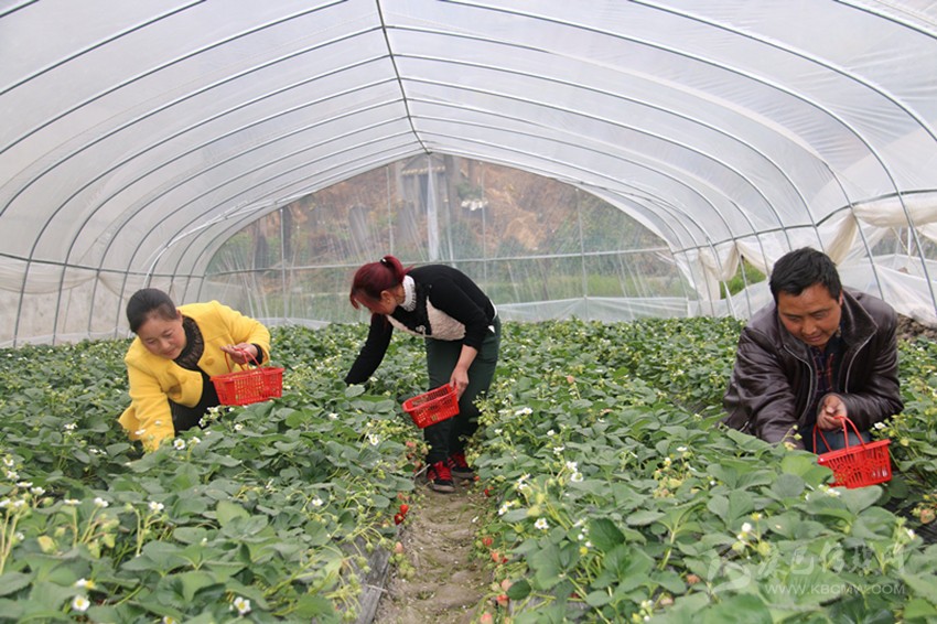 瀘定沈村農(nóng)民在自家大棚里采摘草莓。
